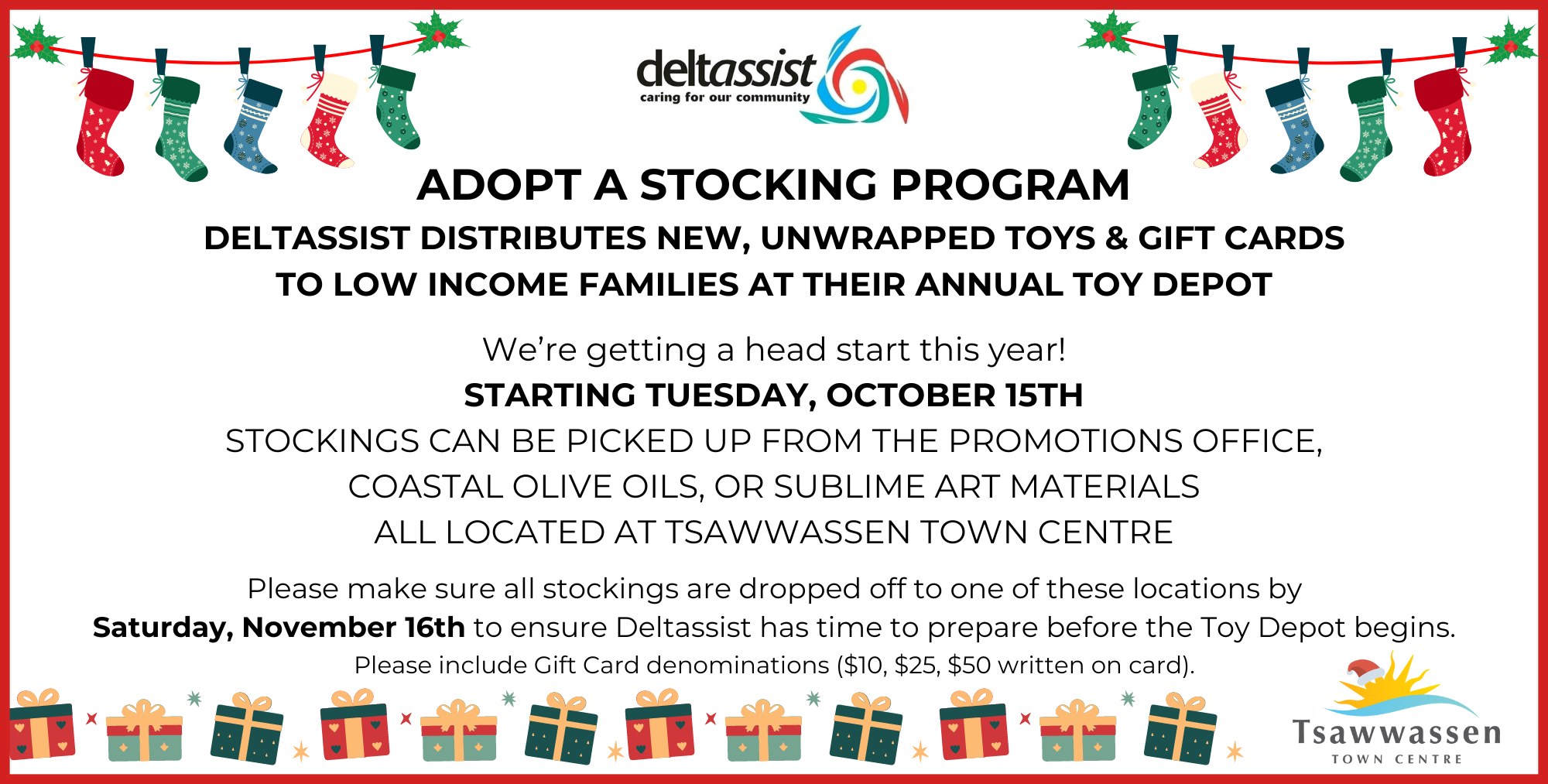 Starting early this year, we will have Christmas Stockings available for you to “adopt” starting Tuesday, October 15th. Stockings will be available for different age groups, boys and girls. You can “adopt” a stocking from Coastal Olive Oils or Sublime Art Materials at Tsawwassen Town Centre. Once stockings are filled please return them to either Coastal Olive Oils or Sublime Art Materials on or before SUNDAY, NOVEMBER 17TH.