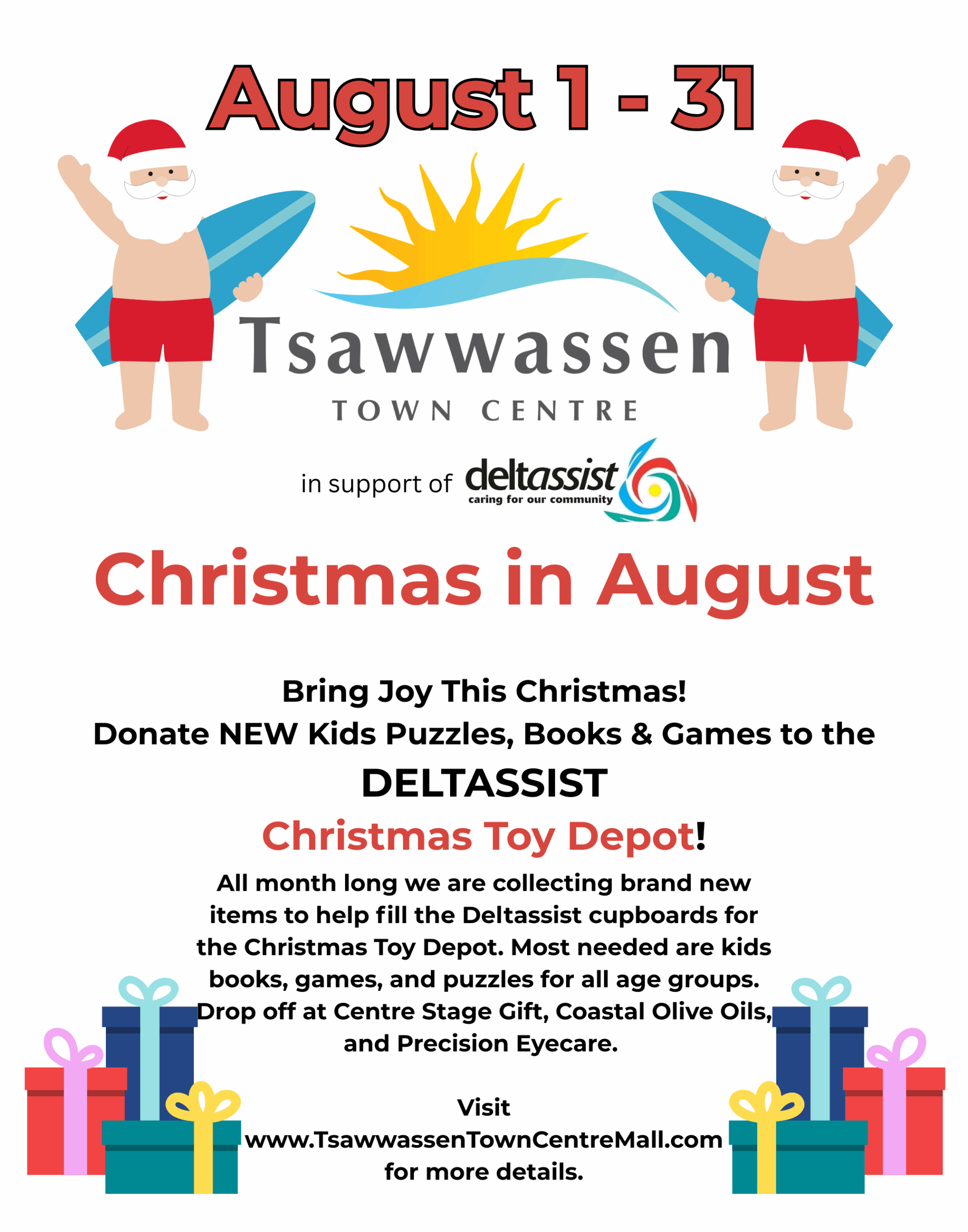 If you would like to donate a band new, unwrapped item to the Christmas Toy Drive, you can drop off at Centre Stage Gifts & Accessories, Coastal Olive Oils, or Precision Eyecare, all located at Tsawwassen Town Centre.