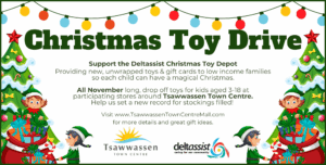 All November long Tsawwassen Town Centre is collecting toys, games, books, and gift cards in support of the Deltassist Christmas Toy Drive. This year they are especially in need of teen “toy” donations. See our post with gift giving suggestions that can all be found here at Tsawwassen Town Centre (coming soon). Instead of adopting a stocking, simply drop off your donations with one of the businesses listed below.
