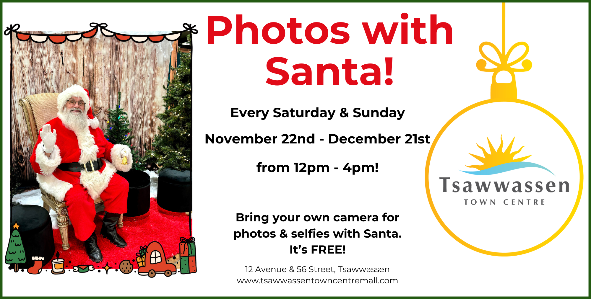 From 12-4 every Saturday and Sunday, Santa will be at Tsawwassen Town Centre. Everyone is welcome to come take their photo with Santa, even well behaved pets! This is a FREE event with no photographer.